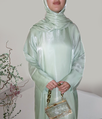 SONDOS is a bestseller, crafted from shiny organza fabric, this soft mint green three-piece abaya set will have you turning heads. Translating to "cloth of heaven" in Arabic, Sondos captures the essence of modern elegance with a colorful and ethereal touch, making it a stunning choice for any event. Includes open abaya, matching short sleeve underdress, and matching scarf.